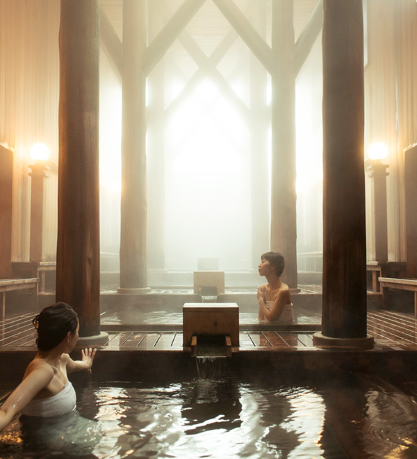 悠久の歴史の中で、良質の湯により栄えてきた草津温泉。草津のシンボル湯畑に再建した御座之湯は、冬住みをしていた江戸~明治の建物を再現し、木造にこだわり、杉板を使用した 「とんとん葺き」の屋根と漆喰の壁からかつての趣が漂います。